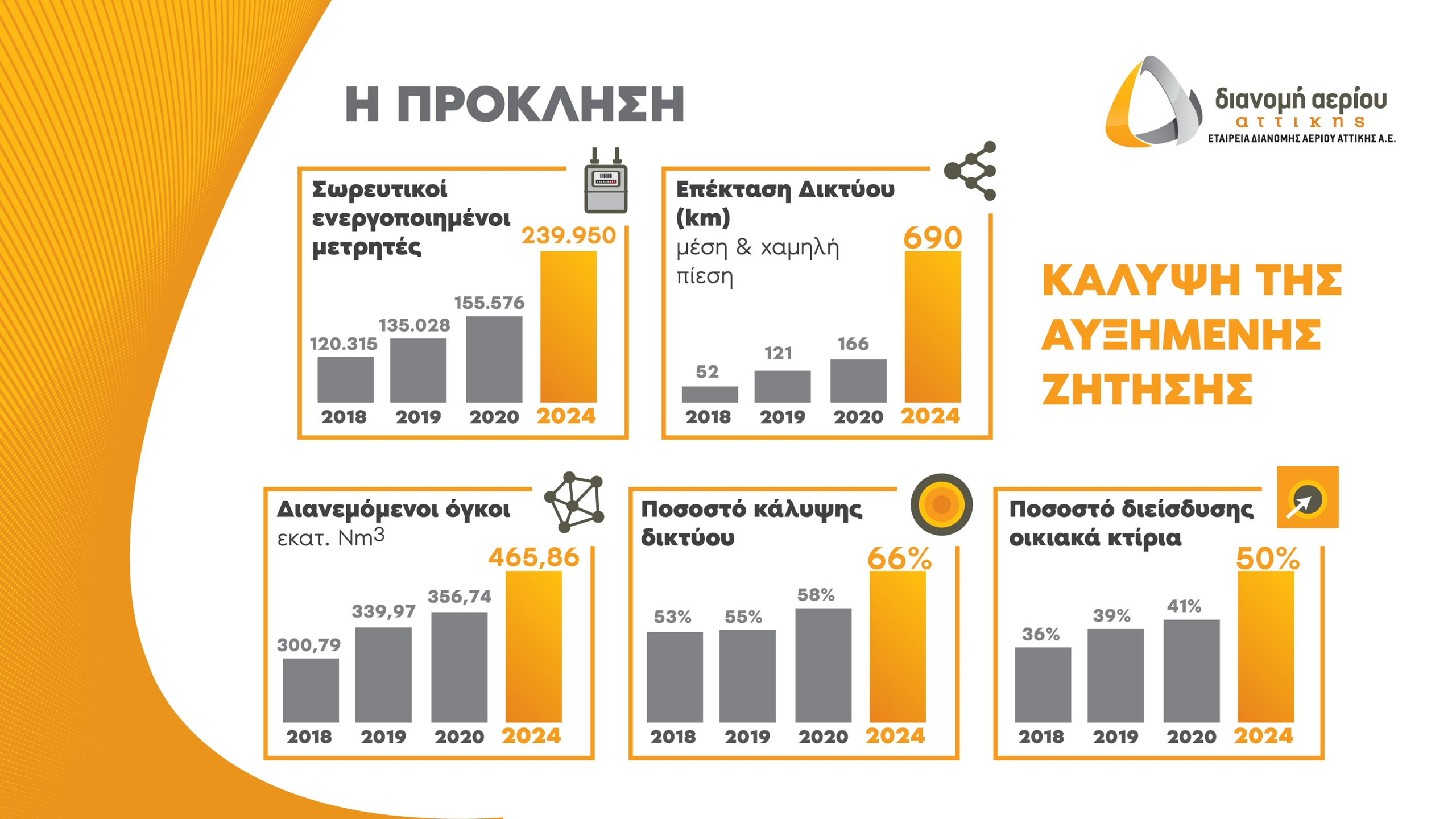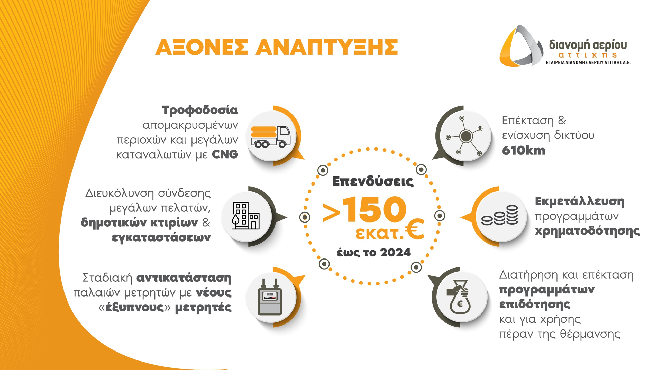 Το νέο φιλόδοξο Πρόγραμμα Ανάπτυξης της Εταιρείας Διανομής Αερίου Αττικής για την περίοδο 2020-2024, σχεδιάστηκε με αυστηρά οικονομοτεχνικά κριτήρια και περιλαμβάνει την εντυπωσιακή επέκταση του δικτύου χαμηλής και μέσης πίεσης κατά 690 χιλιόμετρα την επόμενη πενταετία και τον διπλασιασμό σχεδόν των συνδέσεων, ήτοι 240 χιλιάδες ενεργοποιημένοι μετρητές το 2024, έναντι 135 χιλιάδες το 2019, με τους διανεμόμενους όγκους να αγγίζουν τα 466 εκατ. Nm3, από 340 εκατ. Nm3, στο τέλος του περασμένου έτους.