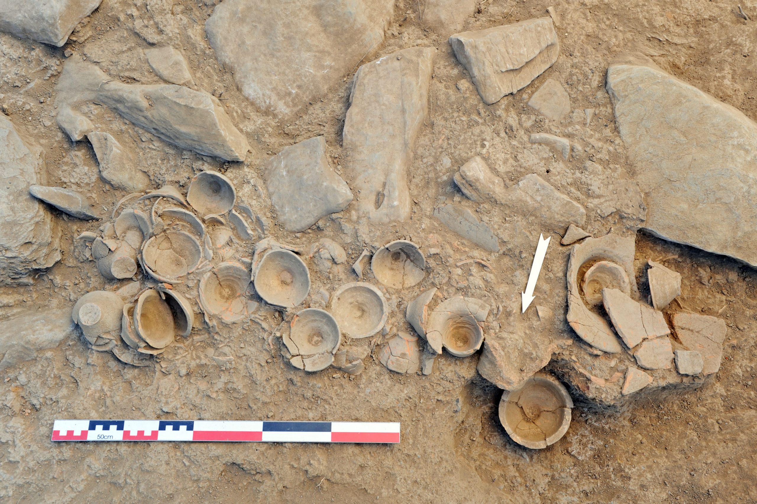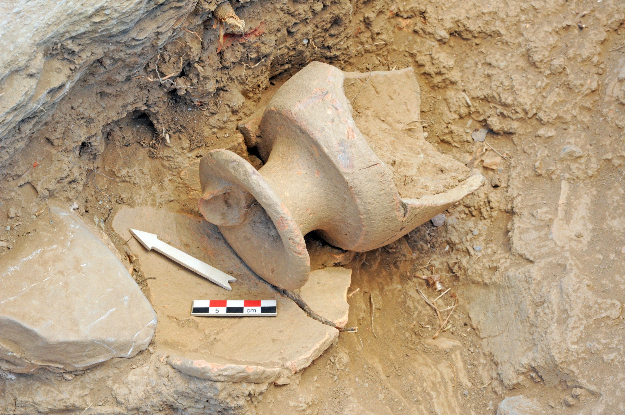 Στο ίδιο επίπεδο βρέθηκε λίθινος, τελετουργικός τριπτήρας και σφραγίδα με παράσταση ζώου στην σφραγιστική της επιφάνεια. Προφανώς, μετά από την πρώτη καταστροφή των νέων ανακτόρων, οι ένοικοι του κτηρίου διαφύλαξαν τα λείψανα του κατεστραμμένου ειδώλου, επάνω από το οποίο κτίστηκε ο λίθινος βωμός με τα τελετουργικά αγγεία, που αναφέρθηκε πιο πάνω.