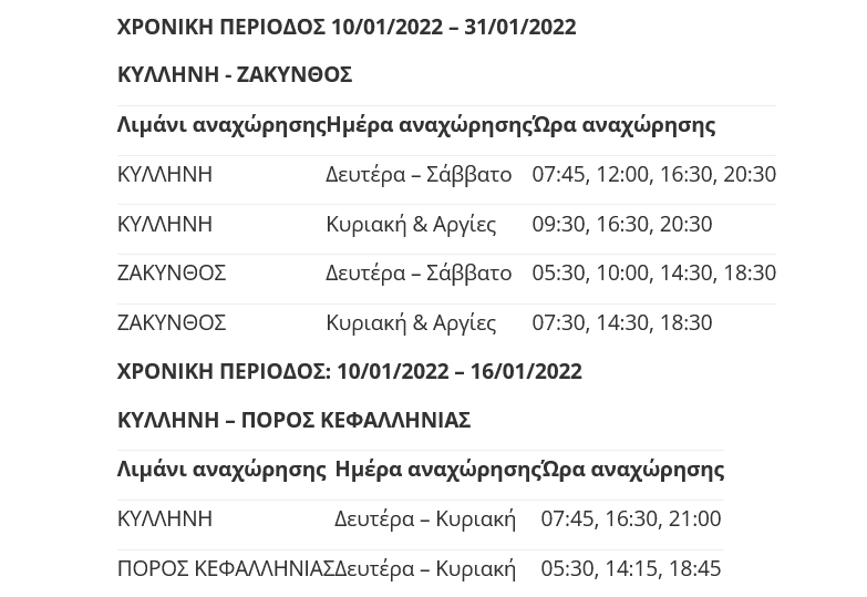 Κάθε Σάββατο, το δρομολόγιο με ώρα αναχώρησης 21:00 από Κυλλήνη προς Πόρο Κεφαλληνίας και κάθε Κυριακή, το δρομολόγιο με ώρα αναχώρησης 05:30 από Πόρο Κεφαλληνίας προς Κυλλήνη θα παραμένουν ανεκτέλεστα.