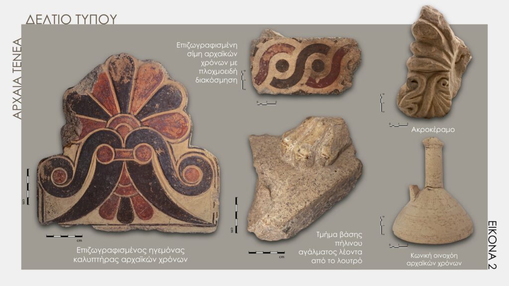 Εν συνεχεία, βόρεια των θερμών δωματίων ανασκάφηκε το τρίτο praefurnium των λουτρών και οι χώροι που εξυπηρετούσαν στην αποθήκευση υλικών-ξυλείας για τη λειτουργεία του. Εντός των τομών αυτών, μεταξύ άλλων ευρημάτων των ρωμαϊκών χρόνων, βρέθηκαν καταπεσμένα αρχιτεκτονικά μέλη αρχαϊκής περιόδου, ένας ηγεμόνας καλυπτήρας και μια επιζωγραφισμένη σίμη με πλοχμοειδή διακόσμηση (Εικ.2), στοιχεία που πιθανώς προέρχονται από κτίριο ίδιας χρονολογικής με αυτά περιόδου, το οποίο πιθανολογείται ότι βρίσκεται στην εγγύτητα του μνημείου και του οποίου έχουν εντοπιστεί σε προγενέστερες ανασκαφικές περιόδους σημαντικά αρχιτεκτονικά μέλη .