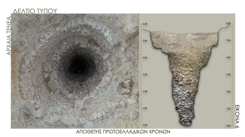 Η σπουδαιότερη ανακάλυψη της φετινής ανασκαφικής περιόδου, που προσθέτει νέα δεδομένα αναφορικά με την κατοίκηση στην περιοχή της Τενέας, είναι η ανασκαφή ενός κτιστού προϊστορικού (Πρώιμης Εποχής Χαλκού) αποθέτη. Εντοπίστηκε βόρεια του λουτρικού συγκροτήματος σε απόσταση 45μ. και σε βάθος περίπου 2μ. από την επιφάνεια του εδάφους. Έφερε επικάλυψη από στρώμα αργών λίθων και σωρεία κεραμικής πάχους περίπου 2μ. Τα εσωτερικά τοιχώματα της εν λόγω κατασκευής αποτελούνται από ομοιόμορφο και ιδιαίτερα επιμελημένο χτίσιμο από αργούς λίθους μεγάλου μεγέθους και στο ανώτερο τμήμα της διαμορφώνονται επάλληλα επίπεδα σπειροειδούς μορφής, που πιθανότατα εξυπηρετούσαν την κάθοδο και την άνοδο στο εσωτερικό της. Το σχήμα του αποθέτη είναι ελλειψοειδές με διαστάσεις αξόνων 3,30μ. x 3,10μ. και το βάθος του κάτω από το στρώμα επικάλυψης φτάνει στα 6.80μ. Ο αποθέτης στενεύει σταδιακά έως το τέρμα του, φτάνοντας να έχει τελικές διαστάσεις αξόνων 0.60μ. x 0,45μ. και εσωτερικό ύψος 4.80μ. .