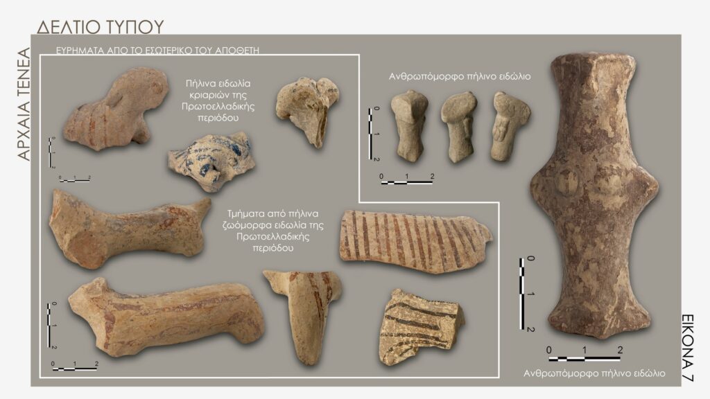 Τα ευρήματα από το στρώμα επικάλυψης αλλά και το εσωτερικό του αποθέτη είναι ιδιαίτερα σημαντικά. Από αυτά ξεχωρίζουν ειδώλια κριαριών, βάσεις αποθηκευτικών αγγείων με αποτύπωμα ψάθας και μία βάση με αποτύπωμα φύλλων, τμήματα από πήλινες εστίες με εγχάρακτη διακόσμηση , τμήματα πιθανόν από φορητές πήλινες τράπεζες προσφορών με σπειροειδή και εγχάρακτη διακόσμηση, πόδια τριποδικών αγγείων και κρατευτών, πρόχοι, πολυάριθμα θραύσματα ανοιχτών αγγείων, φιάλες με μαύρο και ερυθρό επίχρισμα, φιάλες με πόδι και φιάλες με δακτυλιόσχημη ή επίπεδη βάση, κομβιόσχημες λαβές από πίθους, καθώς και σωληνωτές από μεγάλα ανοιχτά αγγεία . Λαβές με έκκρουστη και εγχάρακτη διακόσμηση και τμήματα πίθων με ανάγλυφη σχοινοειδή διακόσμηση. Επιπλέον, ήλθαν στο φως τμήματα από κύμβες (σαλτσιέρες), αρύταινες, πινάκια και τμήμα λίθινου σκεύους . Σημαντικός είναι και ο εντοπισμός μεγάλης ποσότητας σφονδυλιών, καθώς και πυρήνων, λεπίδων και απολεπισμάτων από οψιανό, καθώς και λειασμένων εργαλείων .