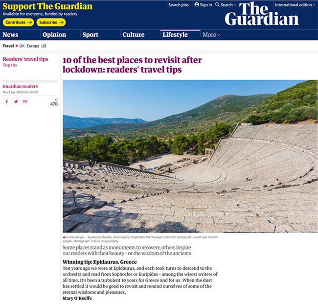 «10 χρόνια πριν βρεθήκαμε στην Επίδαυρο και κάθε ένας πήγαινε στην πλατεία του θεάτρου και διάβαζε Σοφοκλή ή Ευρυπίδη, από τους πιο σοφούς συγγραφείς όλων των εποχών. Ήταν 10 χρόνια ταραχώδη για την Ελλάδα, αλλά και για εμάς. Οταν όλα ηρεμήσουν, θα ήταν καλό να επισκεφθούμε ξανά (την Επίδαυρο) και να θυμηθούμε κάποιες αιώνιες σοφίες και απολαύσεις», γράφει η Mary O’Keeffe, αναγνώστρια της εφημερίδας στο συνοδευτικό κείμενο.