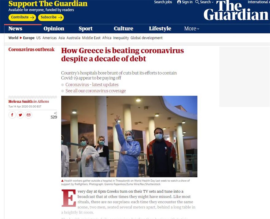 Όπως σημειώνεται στην ανταπόκριση από την Αθήνα «ο φιλομαθής καθηγητής και ο ξεκάθαρος πρώην δήμαρχος έχουν γίνει τα πρόσωπα της προσπάθειας της κυβέρνησης να περιορίσει την εξάπλωση του Covid-19 και οι προσπάθειές τους φαίνεται ότι αποδίδουν. Σε έναν πληθυσμό 11 εκατομμυρίων, την Δευτέρα ανακοινώθηκαν 2.145 επιβεβαιωμένα κρούσματα και 99 θάνατοι (σ.σ. πλέον 101)- πολλοί λιγότεροι από οπουδήποτε αλλού στην Ευρώπη. Η Ιταλία έως σήμερα έχει καταγράψει 20.465 θανάτους. Είναι γενικά αποδεκτό ότι η Ελλάδα περνάει την κρίση πολύ καλύτερα από το αναμενόμενο».