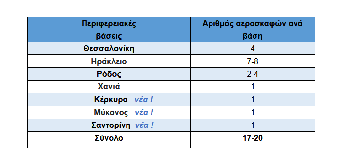 Με 33 νέα απευθείας δρομολόγια, που ενισχύουν σημαντικά τις βάσεις της εταιρείας στη Θεσσαλονίκη, το Ηράκλειο, τη Ρόδο, τα Χανιά, αλλά και τις 3 νέες βάσεις σε Κέρκυρα, Σαντορίνη και Μύκονο, συνολικά θα απασχολήσει 17 έως 20 αεροσκάφη, αποκλειστικά στην περιφέρεια. Με την επιλογή αυτή, η AEGEAN συμβάλει στις προϋποθέσεις για ανάκαμψη του τουρισμού προς την περιφέρεια. Παράλληλα, όπως πάντα, διατηρεί φυσικά τη βάση της Αθήνας με 37-40 αεροσκάφη, ως τον βασικό κόμβο δραστηριότητας του δικτύου της για την προσβασιμότητα και διασυνδεσιμότητα τόσο στην ηπειρωτική Ελλάδα, όσο και στα μικρότερα νησιά.