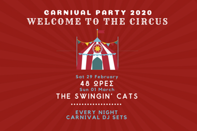 Την Κυριακή 1 Μαρτίου, οι The Swingin’ Cats αναλαμβάνουν την διασκέδασή μας και δημιουργούν το απόλυτο μουσικό σκηνικό με ρετρό διάθεση, διασκευές και σκηνικά βγαλμένα από ταινία, με το καρναβαλικό υπερθέαμα να ολοκληρώνεται με τους DJs του Gazarte που θα συνεχίσουν σε ξέφρενους ρυθμούς!